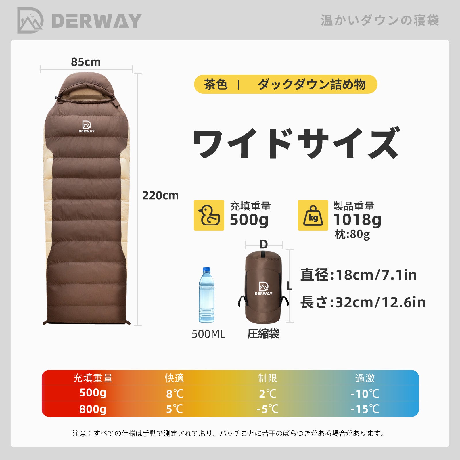 Derway ダウン寝袋 枕付き (220*80cm) 封筒型超軽量小型パッケージ寝袋 680FP、より軽くて暖かい、防災、キャンプ、アウトドア、登山、車用、春、夏、秋、冬の4シーズンに適しています (ブラウン, 羽毛量500g)